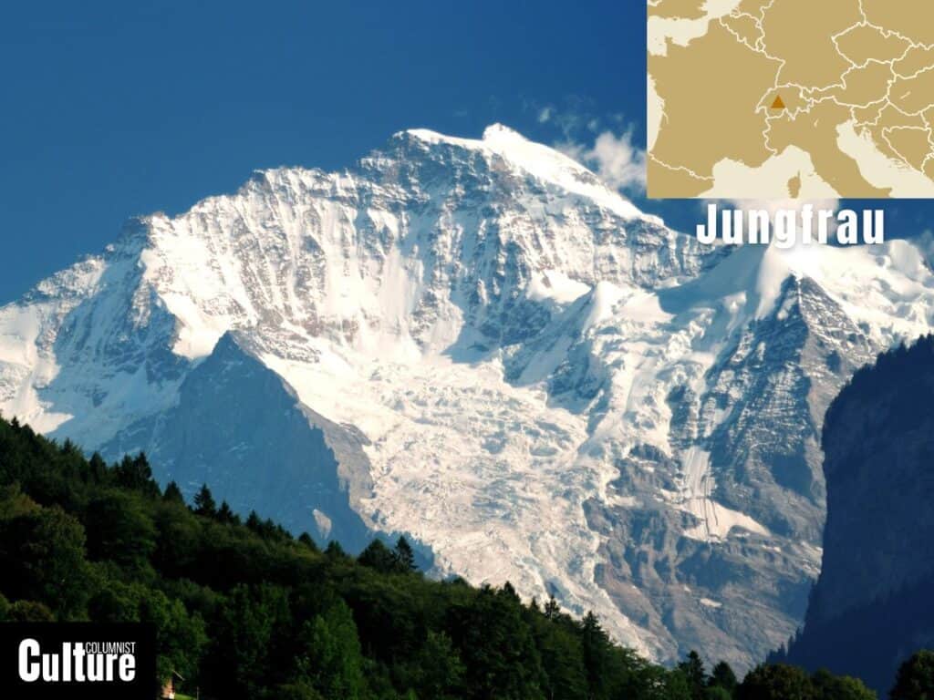 Jungfrau is one of the main summits in the Bernese Alps, situated in south-central Switzerland. It is flanked by two other peaks, the Eiger and the Mönch, which together form a highly recognizable trio of peaks. Its name, meaning “Maiden” in German, is said to derive from legend; it is the “maiden” that is “protected” by the neighboring peaks Eiger and Mönch.